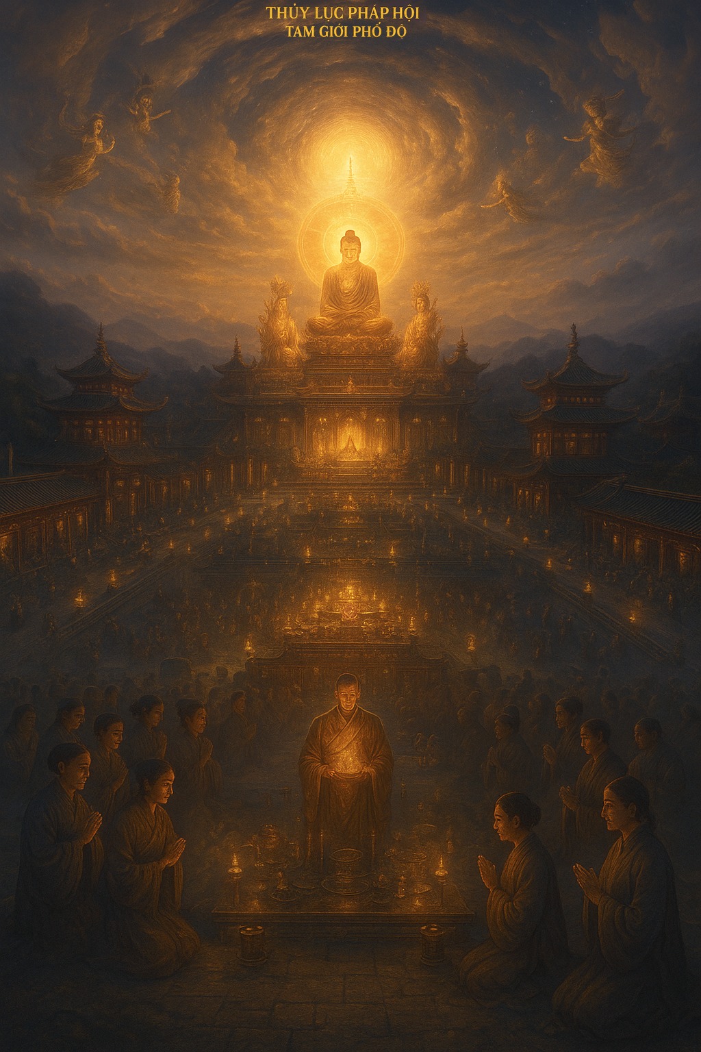 PHÁP HỘI THỦY LỤC: ĐẠI TRAI ĐÀN CHẨN TẾ CỦA PHẬT GIÁO Trong kho tàng nghi lễ Phật giáo Đại thừa, Pháp hội Thủy Lục (Còn gọi là Thủy Lục Đạo Tràng) được tôn vinh là vua của các pháp hội, mang quy mô hoành tráng và ý nghĩa thâm sâu nhất. Tên đầy đủ là “Pháp Giới Thánh Phàm Thủy Lục Phổ Độ Đại Trai Thắng Hội”, pháp hội này là sự kết tinh của tinh thần từ bi, bình đẳng và trí tuệ, hướng đến mục tiêu rộng lớn: siêu độ và gia hộ cho tất cả chúng sinh. Tên đầy đủ là "Pháp Giới Thánh Phàm Thủy Lục Phổ Độ Đại Trai Thắng Hội" (法界聖凡水陸普度大齋勝會). Ý nghĩa được giải thích từng câu như sau: 1. Pháp Giới (法界): Chỉ rằng bản tính của chư Phật và chúng sinh đều bình đẳng, "Lý" thường là một, nên thông gọi là Pháp Giới. 2. Thánh phàm (聖凡): Chỉ Tứ Thánh trong Thập Pháp Giới, tức là Phật, Bồ Tát, Duyên Giác, Thanh Văn; và Lục Phàm là Trời, Người, A-tu-la, Địa ngục, Ngạ quỷ, Súc sinh. 3. Thủy lục (水陆): Chỉ nơi cư trú và thọ báo của chúng sinh trong ba cõi: Thủy (sông nước), Lục (đất liền) và Không (hư không). Chúng sinh bay trong hư không cần nương vào đất liền để nghỉ ngơi, nên được bao gồm trong đất liền mà gọi là Thủy Lục. 4. Phả độ (普度): Nghĩa là đều độ hết thảy chúng sinh trong Lục đạo, giúp họ giải thoát khỏi những khổ đau của sự đói khát. 5. Đại trai (大齋): Nghĩa là cúng dường thức ăn không hạn chế cho chúng sinh, khiến tâm họ khai mở, ý giải thoát, được thấm nhuần Pháp thủy (nước pháp), nên gọi là Thắng Hội. 6. Thắng Hội (勝會): Là ý nghĩa tụ tập. Người cứu độ và kẻ được độ tụ họp một nơi, thức ăn và Phật pháp đều cùng nhau, nên gọi là Hội. Tức là, nhờ vào công đức của việc kiến lập Pháp hội Thủy Lục Phổ Độ Đại Trai này, để siêu độ chúng sinh đang chịu khổ trong Lục đạo, khiến họ lìa khổ được vui, hướng đến Phật đạo. ❤️ Ý Nghĩa Thâm Sâu: Từ Bi Bình Đẳng Danh hiệu của pháp hội tự nó đã hàm chứa một triết lý sâu xa. "Pháp Giới" chỉ toàn thể vũ trụ, nơi bản tính của chư Phật và chúng sinh vốn bình đẳng. "Thánh Phàm" bao gồm toàn bộ mười pháp giới, từ Tứ Thánh (Phật, Bồ Tát, Duyên Giác, Thanh Văn) đến Lục Phàm (Trời, Người, A-tu-la, Địa ngục, Ngạ quỷ, Súc sinh). "Thủy Lục" tượng trưng cho tất cả môi trường sống - sông nước, đất liền và hư không. "Phổ Độ" là cứu độ rộng khắp, không bỏ sót một chúng sinh nào. Cuối cùng, "Đại Trai Thắng Hội" là đại lễ cúng dường trai thực và Pháp thực một cách trọng thể. Như vậy, Thủy Lục không đơn thuần là một lễ cúng cho người đã khuất, mà là một đại hội tâm linh quy tụ toàn thể vũ trụ, từ các bậc Giác ngộ cho đến những chúng sinh đang đau khổ nhất, cùng được thụ hưởng pháp vị và vật thực, hướng đến sự giải thoát rốt ráo. ❤️ Quy Mô Hoành Tráng và Nghi Thức Trọng Thể Một Pháp hội Thủy Lục chuẩn mực thường được tổ chức trong 7 ngày đêm, với một cấu trúc nghi lễ phức tạp và trang nghiêm, tập trung vào hai khu vực chính: 🎗️Ngoại Đàn: Là nơi đại chúng cùng tham gia tu tập, gồm nhiều đàn tràng chuyên tụng niệm các bộ kinh Đại thừa trọng yếu như Lương Hoàng Bảo Sám, Hoa Nghiêm, Pháp Hoa, Di Đà... cùng các nghi thức như Phóng sinh, Trai Thiên (cúng chư thiên) và Thí thực Phóng Diệm Khẩu (cúng thí cho ngạ quỷ). 🎗️ Nội Đàn: Là trái tim của toàn bộ pháp hội, nơi diễn ra các nghi thức cốt lõi và bí mật. Nội đàn được "kết giới" thành một khu vực thanh tịnh, trang nghiêm, được bảo vệ bởi chư Hộ pháp. Các nghi thức chính yếu tuần tự diễn ra: 🎗️ Kết giới: Thiết lập một đàn tràng thanh tịnh, kiên cố như kim cang. 🎗️ Phát phù, treo phan: Phái các sứ giả (biểu tượng) đi khắp pháp giới và treo cờ phan để báo hiệu, thỉnh mời Thánh chúng và chúng sinh. 🎗️Thỉnh Thượng đường, Cúng dường Thượng đường: Cung thỉnh chư Phật, Bồ Tát, Thánh chúng giáng lâm và dâng lên sự cúng dường tối thượng. 🎗️Thỉnh Hạ đường, Thọ Giới U Minh: Thỉnh mời và truyền thọ giới pháp cho các vong linh, chúng sinh trong lục đạo, giúp họ sám hối nghiệp chướng, thanh tịnh thân tâm. 🎗️Tống Thánh : Nghi thức cuối cùng, tiễn đưa chư Thánh và dùng pháp lực siêu độ tất cả chúng sinh vãng sinh về Tây Phương Tịnh Độ, thông qua biểu tượng "đốt thuyền Bát-nhã" (Thuyền Tây Phương). ❤️ Giá Trị Cốt Lõi: Chuyển Hóa Tâm Thức Tham dự Thủy Lục không phải là một hình thức mua bán công đức. Giá trị cốt lõi nằm ở sự chuyển hóa nội tâm của người tham dự. Ấn Quang Đại sư dạy: "Một phần thành kính, một phần công đức". Chính sự chí thành, thanh tịnh và phát khởi Bồ đề tâm (tâm nguyện vì lợi ích tất cả chúng sinh) của chủ lễ, Pháp sư và đại chúng mới là nhân tố then chốt tạo nên sự cảm ứng đạo giao nhiệm mầu với Phật lực và chúng sinh. Pháp hội Thủy Lục là một k