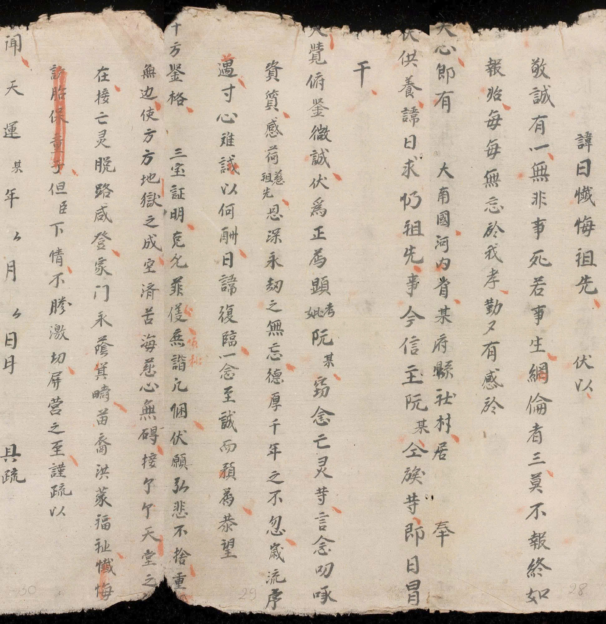 Văn sớ ngày giỗ tổ tiên và sám hối cầu an. Kính cẩn dâng lời rằng: Kính thành một lòng, không gì hơn là thờ người đã khuất vẫn như lúc còn người còn trên cõi . Đạo lý ba giềng mối, không gì hơn là báo đáp lúc sau cuối cũng như khi bắt đầu. Luôn luôn không quên đạo hiếu của mình, siêng năng cảm động đến lòng trời. Nay có, tại làng xã, huyện phủ, tỉnh Hà Nội, nước Đại Nam, người phụng thờ Phật, cúng dường, ngày giỗ sám hối tổ tiên, cầu bình an cho con cháu. Nay chủ tín là Nguyễn Văn Mỗ cùng toàn tộc kính cẩn dâng lời. Cúi xin đức Phật từ bi soi xét lòng thành. Kính vì tiến cúng vong linh hiển khảo (hiển tỷ) Nguyễn Văn Mỗ v.v… Kính nghĩ các vong linh ơi ! Nhờ ơn tiên tổ, cảm nhận ân đức sâu dày. Ơn sâu muôn kiếp chẳng quên, đức dày ngàn năm không chểnh mảng. Năm tháng trôi qua, lòng nhỏ khó biết lấy gì đền đáp. Ngày giỗ lại đến, một lòng thành kính xin dâng lễ. Kính mong. Mười phương chứng giám, Tam bảo chứng minh. Xin nhận lễ mọn, thỏa lòng thành kính. Cúi xin. Đức Phật từ bi không bỏ, cứu độ vô biên. Khiến cho khắp nơi địa ngục đều trống không, cứu khổ hải tâm từ không ngăn ngại. Đón rước từng vong linh lên thiên đường vĩnh viễn, tiếp vong linh thoát khỏi nẻo khổ đau. Gia đình mãi mãi được phúc ấm, con cháu hưởng phúc lành dồi dào. Nhưng kẻ bề tôi lòng thành không hết, kính cẩn dâng sớ này lên. Ngày tháng năm . !Kính cẩn dâng sớ Thầy Bùi Quang Tuấn
