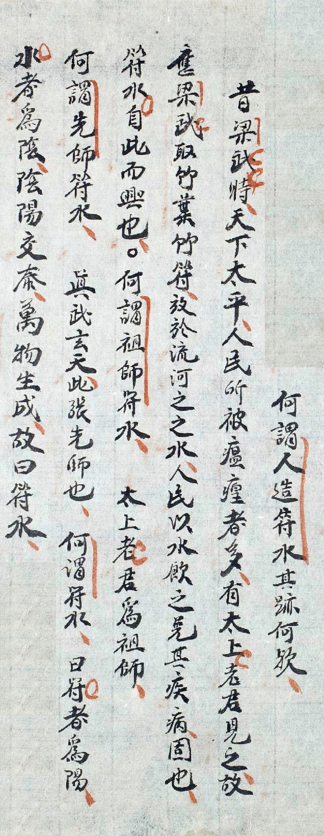Hỏi : Người tạo ra bồ thủy là ai ? tích ấy thế nào ? Đáp : Xưa thời Lương Vũ Đế thiên hạ hưng yên , người dân bị dịch bệnh khá nhiều . Thái thượng lão quân thấy điều đó , mới ứng vào ông Lương Vũ lấy lá tre trúc làm phù ném vào dòng sông , nhân dân lấy nước đó uống để trừ tật bệnh , ấy vậy đó . Bồ thủy từ đó mà hưng . Hỏi : Ai gọi là tổ sư của bồ thủy ? Đáp : Thái Thượng Lão Quân là tổ sư . Hỏi : Tiên sư bồ thủy là ai ? Đáp : Chân Vũ Huyền Thiên ấy Trương Thiên Sư . Hỏi : Thế nào là phù thủy ? Đáp : Phù là dương , Thủy là âm . Âm dương giao thái muôn vật sinh thành , ấy gọi là bồ thủy . Thầy Bùi Quang Tuấn